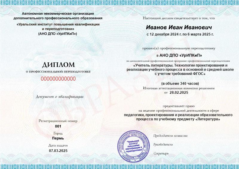 - Образец диплома о профессиональной переподготовке.
